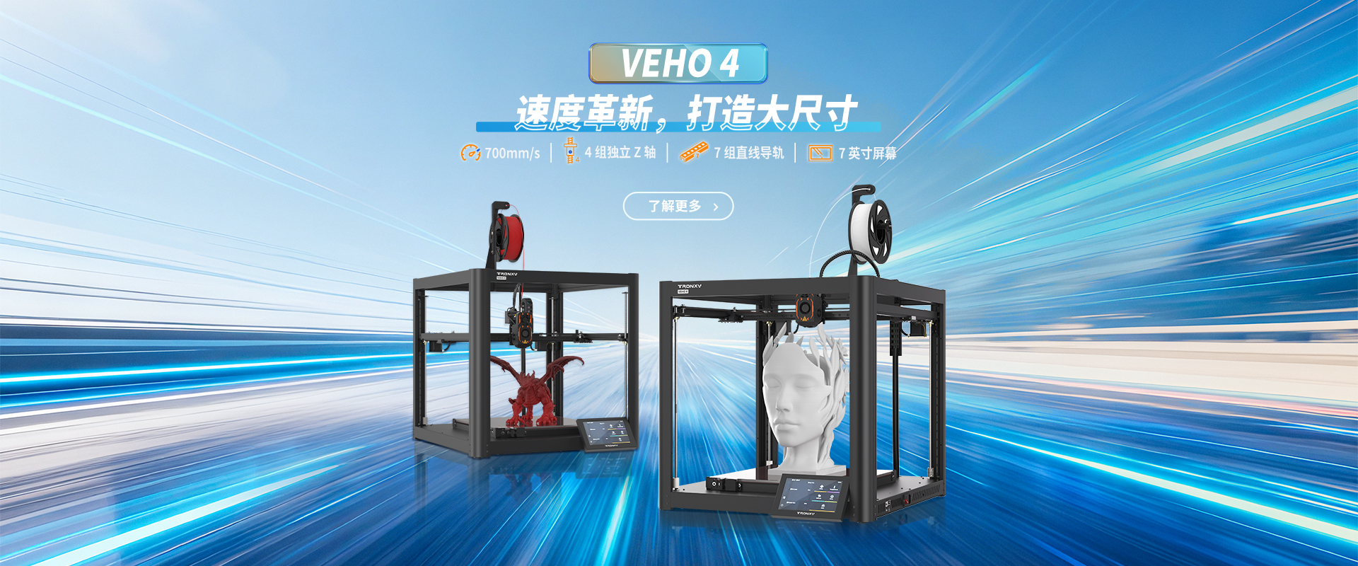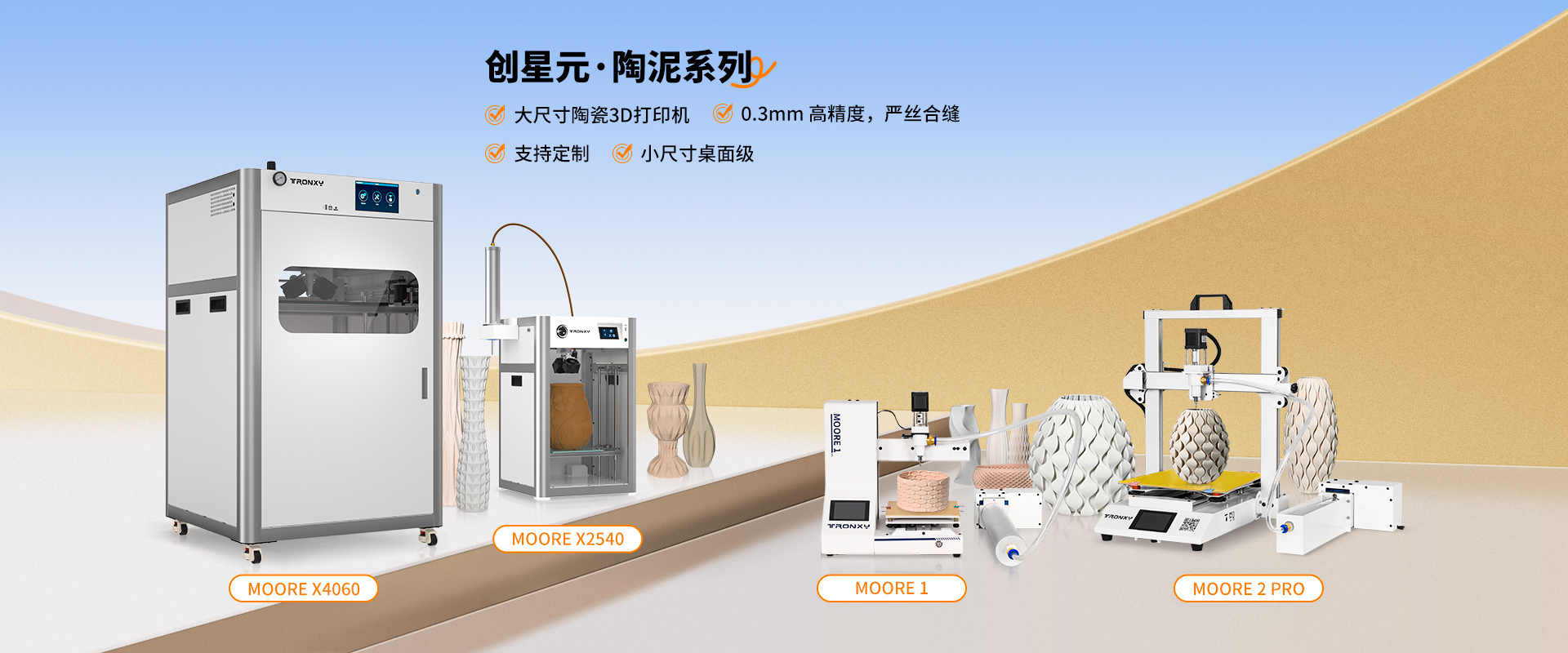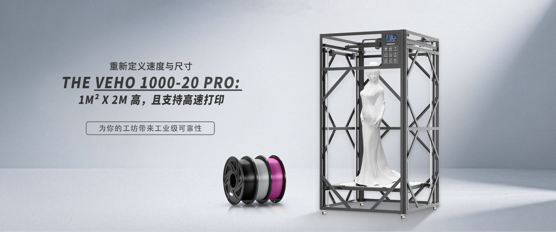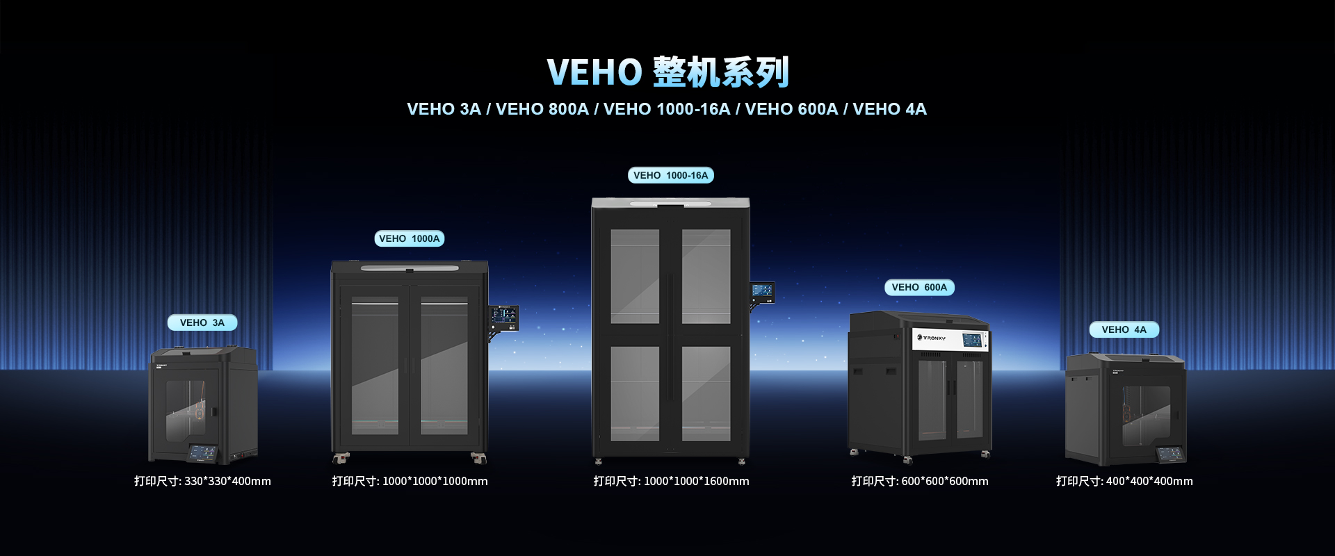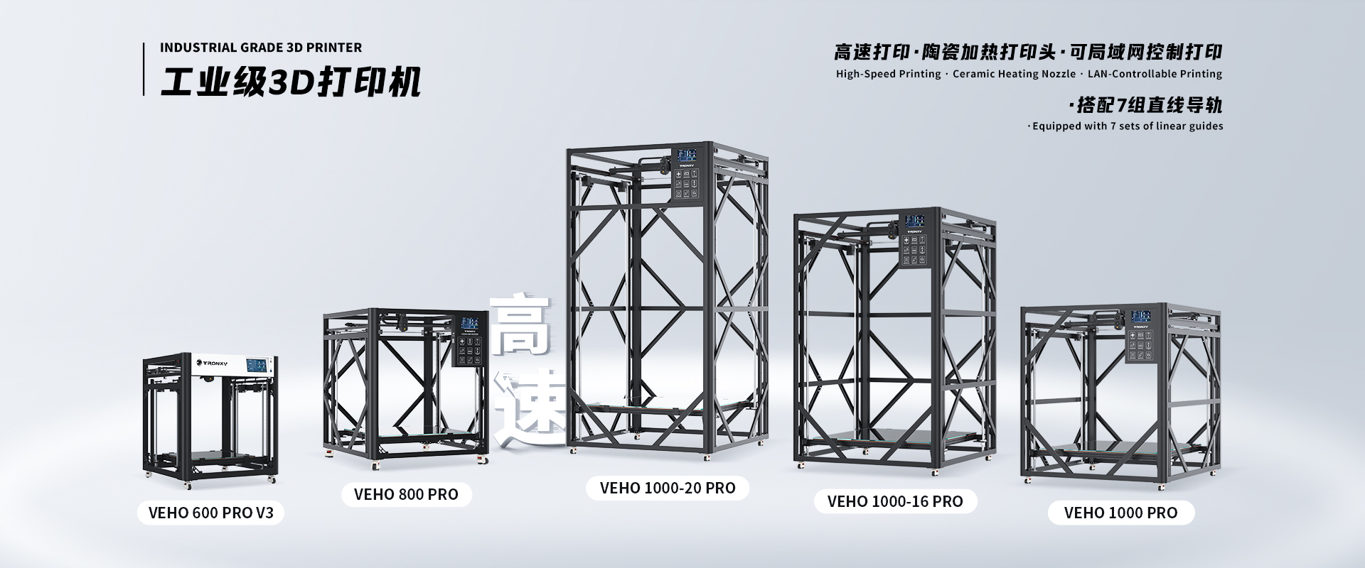 自主设计,定制生产线,可生产从桌面级到工业级等 尺寸从180mm到1.6米的3D打印机